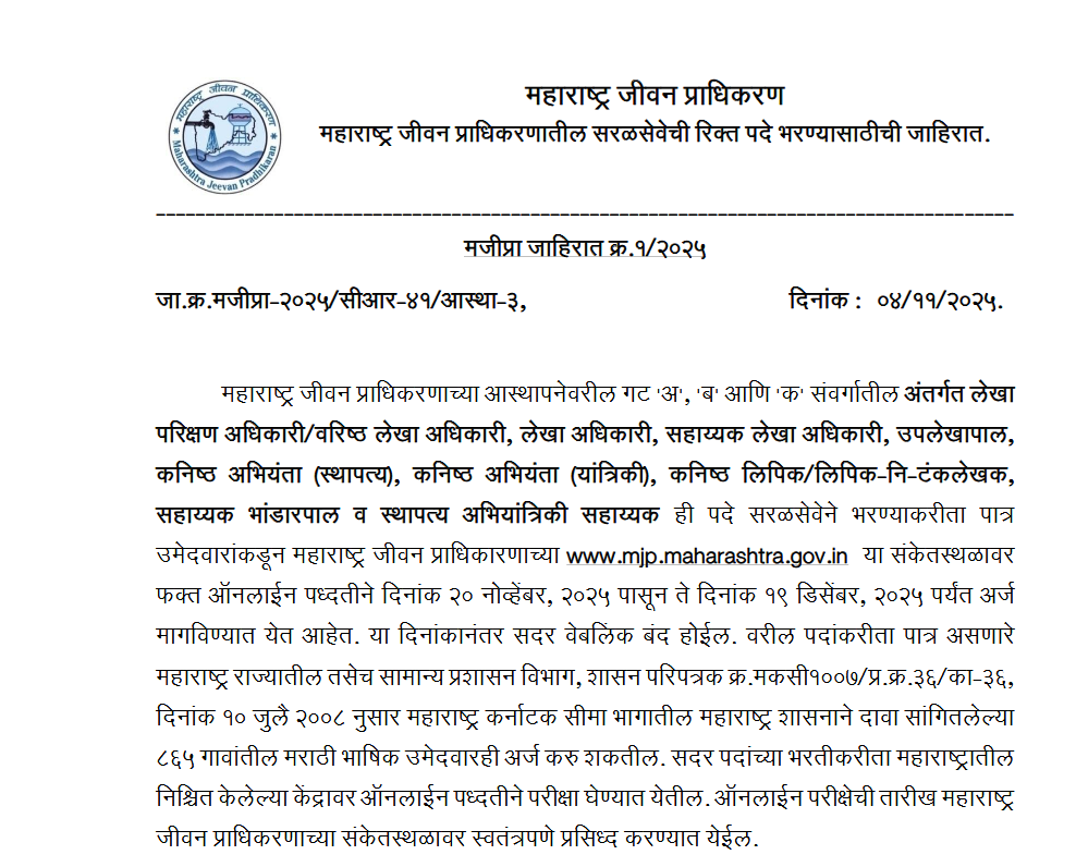 Maharashtra Jeevan Pradhikaran Bharti 2025 | महाराष्ट्र जीवन प्राधिकरण भरती