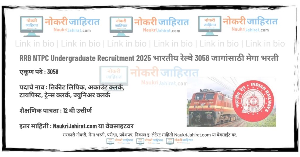 RRB NTPC Under Graduate Bharti 2025 भारतीय रेल्वेत उच्च माध्यमिक स्तर 3058 जागांसाठी मेगाभरती